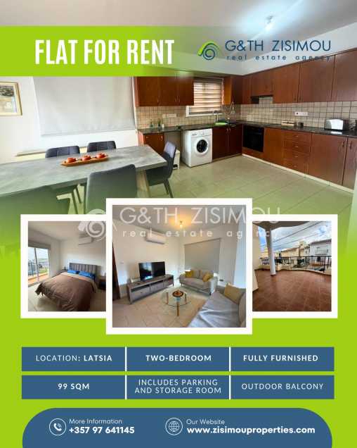 A fully furnished two-bedroom apartment is available for rent in Latsia, Nicosia.
